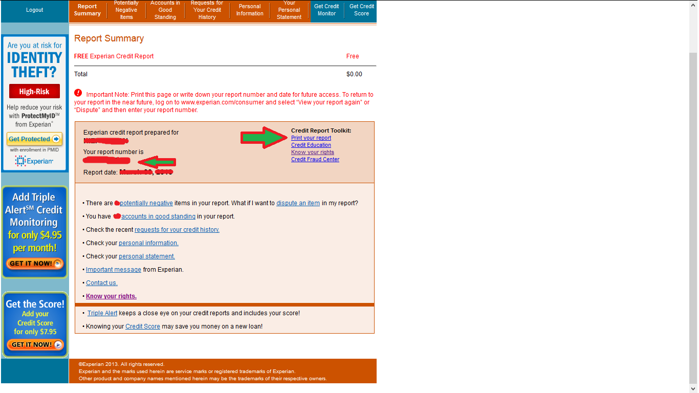 The trick I wanted to show you will help you return to the easily navigated electronic report even after you leave the Experian site. Save the report number which the small green arrow points at. If you have saved your report using the first method, the number will be there. Then, go to the following address: https://www.experian.com/consumer/cac/InvalidateSession.do?code=DISPUTE&channel=8348