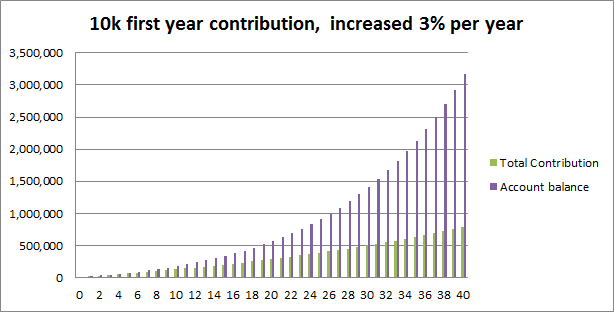 In my previous post, I hinted at why putting your money away in a checking account may not be a good way to save for retirement. Let’s compare this strategy with investing the money saved away. Consider this graph which I used for another post (“The power of compound interest”) a while ago:
